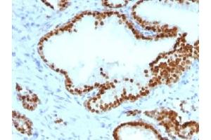 The transcription factor Forkhead-box A1, also known as hepatocyte nuclear factor 3-alpha, is a member of the FOX class of transcription factors. HNF-1 (alpha and beta), HNF-3 (alpha, beta and gamma), HNF-4 (alpha and gamma), and HNF-6 compose, in part, a homeoprotein family designated the hepatocyte nuclear factor family. The various HNF-1 isoforms regulate transcription of genes in the liver as well as in other tissues such as kidney, small intestine and thymus. FOXA1 is expressed in normal breast ductal epithelium and other epithelium in different organs, such as lung, pancreas, bladder, prostate, and colon. Recently, FOXA1 has been shown to be a major determinant of estrogen-ER activity and endocrine response in breast cancer cells. Its expression correlates with estrogen receptor (ER)-positivity, especially in luminal subtype A breast cancers, which is associated with favorable prognosis. FOXA1 is useful in the sub-classification of breast carcinomas.
