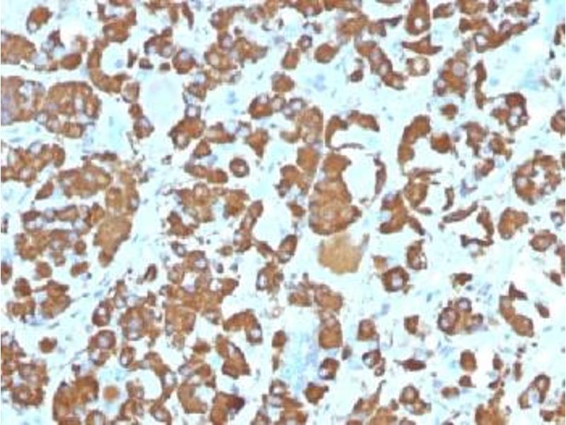 Pituitary growth hormone (GH) plays a crucial role in stimulating and controlling the growth, metabolism and differentiation of many mammalian cell types by modulating the synthesis of multiple mRNA species. These effects are mediated by the binding of GH to its membrane-bound receptor, GHR, and involve a phosphorylation cascade that results in the modulation of numerous signaling pathways. GH is synthesized by acidophilic or somatotropic cells of the anterior pituitary gland. Anti-GH is a useful marker in classification of pituitary tumors and the study of pituitary disease (acromegaly).