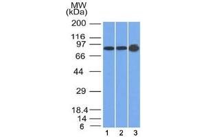 Recognizes a protein of 75 kDa, identified as Plakophilin 1 (PKP1). Plakophilins 1, 2, 3 and 4 (PKP1-4) influence development and participate in linking cadherins to cytoskeletal intermediate filaments. PKP1-4 contain arm-repeat (armadillo) domains and localize to nuclei and cell desmosomes (cell-cell junctions found in suprabasal layers of stratifying epithelia that undergo mechanical stress). PKP2 is important for desmosome assembly and is an essential morphogenic factor and architectural component of the heart.