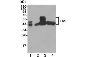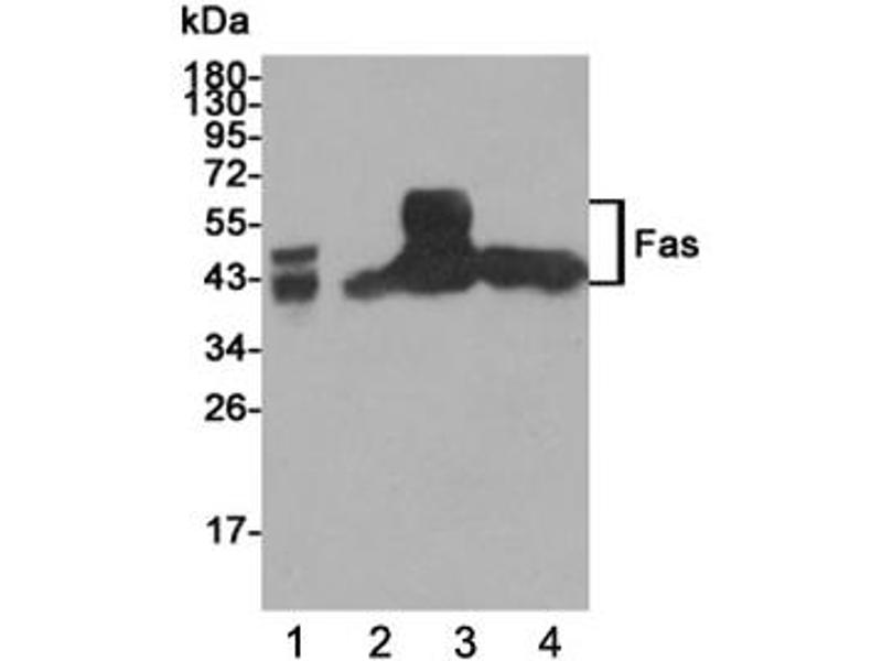 The stated application concentrations are suggested starting points. Titration of the Fas antibody may be required due to differences in protocols and secondary/substrate sensitivity.\. Western blot: 1:1000