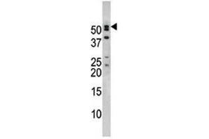 Titration of the NUP50 antibody may be required due to differences in protocols and secondary/substrate sensitivity.\. Western blot: 1:1000
