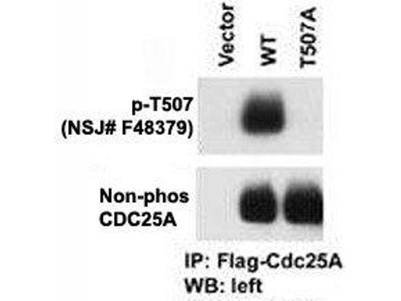 This phospho-CDC25A antibody was produced from rabbits immunized with a KLH conjugated synthetic phosphopeptide corresponding to amino acid residues surrounding pT507 of human CDC25A.