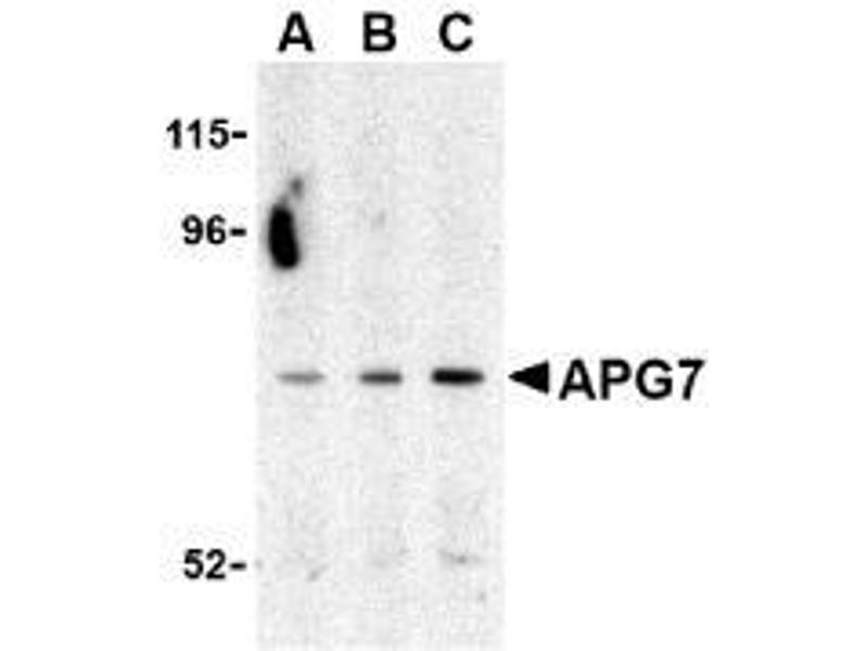 ELISA. Western blot: APG7 antibody can be used for the detection of APG7 at 0.5-1 μg/mL. Positive Control: Caco-2 Cell Lysate. Immunocytochemistry. Positive Control: MCF7 Cell Lysate. Other applications not tested. Optimal dilutions are dependent on conditions and should be determined by the user.