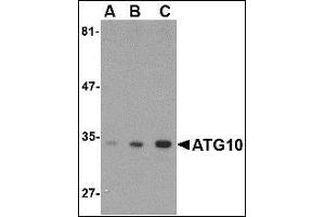 ELISA. Western blot: ATG10 antibody can be used for the detection of ATG10 at 0.5-1 μg/mL. Positive Control: SK-N-SH Cell Lysate. Other applications not tested. Optimal dilutions are dependent on conditions and should be determined by the user.