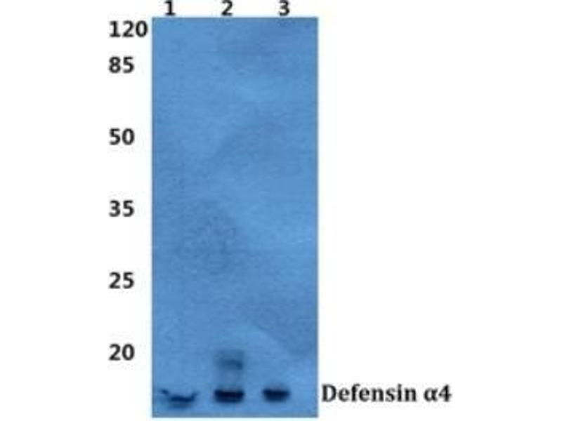 Human neutrophil alpha-defensins (also designated HNPs) are small, cationic, cysteine-rich antimicrobial proteins that play important roles in innate immunity against infectious microbes such as bacteri,a fungi and enveloped viruses. Alpha-defensins are synthesized as inactive precursors and are activated by proteolytic cleavage by MMP-7. Paneth cells in small intestinal crypts secrete the alpha-defensins, which are also termed cryptidins in mice. The cryptidin-4 gene is unique among the Paneth cell alpha defensins in that it is inactive in the duodenum, but expressed at maximal levels in the distal small bowel.Synonyms: DEF4, DEFA4, HNP-4, HP-4, Neutrophil defensin 4