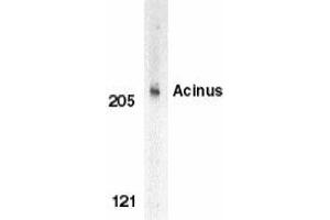 ELISA. Western Blot: Acinus antibody can be used for detection of Acinus at 0.5 to 1 μg/mL. Anapproximate 220 kDa band can be detected. Immunocytochemistry. Other applications not tested. Optimal dilutions are dependent on conditions and should be determined by the user.