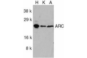 ELISA. Western Blot: ARC antibody can be used for detection of ARC at 1/1000 dilution. Anapproximately 25 kDa band can be detected. Immunohistochemistry. Other applications not tested. Optimal dilutions are dependent on conditions and should be determined by the user.