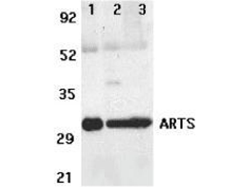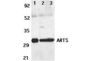 - ARTS antibody was raised against a synthetic peptide corresponding to amino acids near the amino terminus of human ARTS.