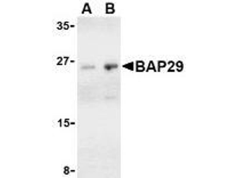 Bap29 and the related protein Bap31 are endoplasmic reticulum (ER) and ER-vesicle membrane proteins and members of the B-cell receptor-associated protein family (1,2). These two proteins are highly homologous and can form homo- and heterodimers. Both Bap29 and Bap31 interact with membrane-bound immunoglobulins (mIgs), such as IgM and IgD, which with Ig-alpha/Ig-beta heterodimers form B cell antigen receptors (3). Binding of the Bap29/Bap31 heterodimer correlates with the ER retention of non-Ig-alpha/Ig-beta bound mIg complexes, suggesting that Bap29 and Bap31 may act as chaperones transmembrane regions of various proteins (3). Bap29 possesses multiple isoforms.Synonyms: B-cell receptor-associated protein 29, BCR-associated protein Bap29