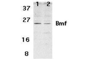 ELISA. Western Blot: Bmf antibody can be used for detection of Bmf at 2 μg/mL. HepG2 or 293 celllysate can be used as a positive control and a band at approximately 25 kDa can bedetected. Immunocytochemistry. Other applications not tested. Optimal dilutions are dependent on conditions and should be determined by the user.