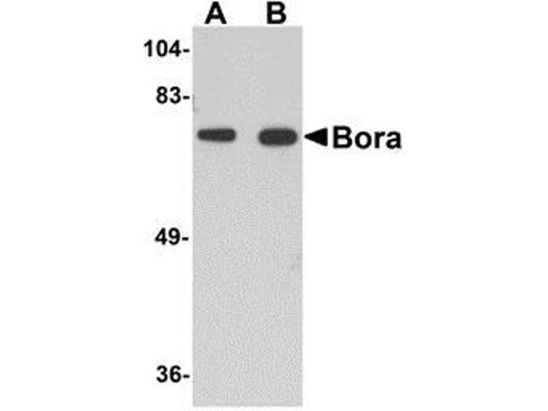 Bora (Protein aurora borealis) is a key activator of Aurora Related Protein Kinase A (ARK-1), which is a centrosome-associated serine/threonine kinase that regulates centrosome maturation, bipolar spindle assembly and chromosome segregation during mitosis. Bora is localized to the nucleus until mitosis is initiated, then translocates to the cytoplasm in a Cdc2 dependent manner. Activation of Cdc2 initiates the release of Bora into the cytoplasm where it can bind and activate ARK-1. PLK1 (polo-like kinase-1) interacts with Bora to control the accessibility of its activation loop for phosphorylation and activation by ARK-1. Bora and ARK-1 cooperatively activate PLK1 and control mitotic entry. Bora mutants result in multipolar spindles in mitosis identical to those observed when ARK-1 function is blocked. Thus, the ARK1-Bora-PLK1 regulatory circuit in mammalian cells elucidates a key mechanism in cell cycle regulation. At least three isoforms of Bora are known to exist.Synonyms: BORA, C13orf34, FLJ22624, HsBora