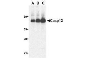 ELISA. Western Blot: Caspase-12 (large) antibody can be used for the detection of both thepropeptide and cleaved forms of caspase-12 at 0.5 to 2 μg/mL. Immunohistochemistry.