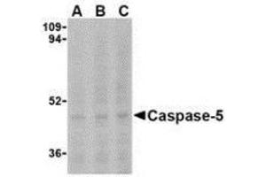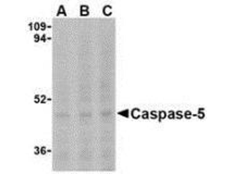ELISA. Western Blot: Casp-5 antibody can be used for the detection of Caspase-5 at 1 μg/mL. Depending on cell lines or tissues used, other cleavage products may be observed. Other applications not tested. Optimal dilutions are dependent on conditions and should be determined by the user.