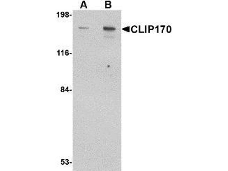 ELISA. Western Blot: CLIP170 antibody can be used for detection of CLIP170 at 0.5 - 1 μg/mL. Immunofluorescence. Other applications not tested. Optimal dilutions are dependent on conditions and should be determined by the user.