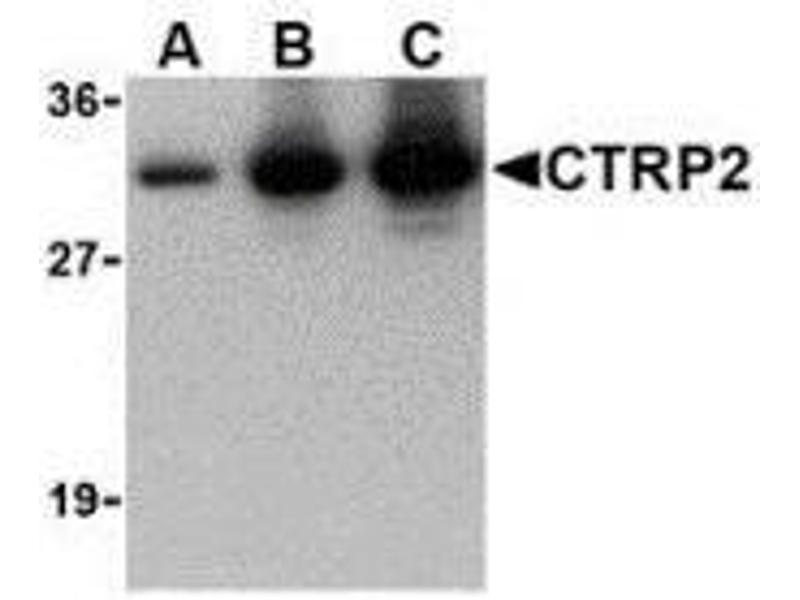 ELISA. Western Blot: CTRP2 antibody can be used for the detection of CTRP2 at 1 μg/mL. Caco-2cell lysate can be used as positive control. These proteins are often highly modifiedpost-translationally and migrate in SDS-PAGE at positions other than their predicted size. Immunocytochemistry. Other applications not tested. Optimal dilutions are dependent on conditions and should be determined by the user.
