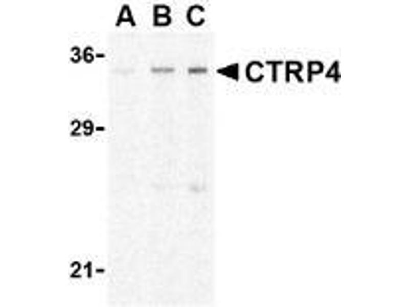 ELISA. Western Blot: CTRP4 antibody can be used for the detection of CTRP4 at 1 - 2 μg/mL. Ratbrain cell lysate can be used as positive control. These proteins are often highly modifiedpost-translationally and migrate in SDS-PAGE at positions other than their predicted size. Immunohistochemistry. Other applications not tested. Optimal dilutions are dependent on conditions and should be determined by the user.