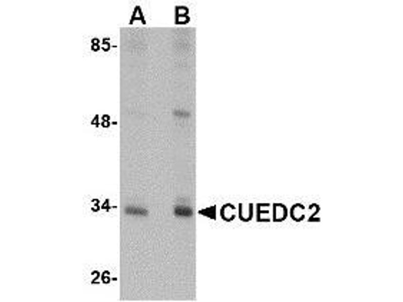 The CUE (coupling of ubiquitin conjugation to endoplasmic reticulum degradation) domain is an evolutionarily conserved, ~40 amino acid monoubiquitin-binding domain that mediates intramolecular monoubiquitylation. CUE domains are present in eukaryotic proteins that are involved in ubiquitination and protein trafficking pathways and may be required for ubiquitination of the proteins in which they are found. CUEDC2 (CUE domain-containing protein 2) was found through a yeast two-hybrid screening as a protein that interacts with the progesterone receptor (PR) and promotes progesterone-induced PR degradation by the ubiquitin-proteasome pathway. CUEDC2 also decreases the sumoylation of PR. CUEDC2 has also been found to interact with IKK-a and IKK-b and decrease the activation of NF-kB by decreasing the activation of IKK. CUEDC2 antibody will not cross-react with CUEDC1.Synonyms: C10orf66, CUE domain-containing protein 2, HOYS6