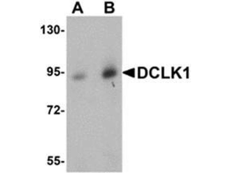 DCLK1 is one of three doublecortin-like kinases similar to the Ca2+/calmodulin-dependent protein kinase (CaMK) family. DCLK1 mRNA, like that of the homologous DCLK2 and DCLK3, is highly expressed in adult brain, but only DCLK1 and DCLK2 transcripts are present in human fetal brain and the developing mouse embryo, suggesting that DCLK1 and DCLK2 may play roles in cortical development. The DCLK proteins are homologous to Doublecortin (DCX), a gene that is mutated in X-linked human lissencephaly. In mouse models where the DCX gene has been disrupted, DCLK1 expression increases slightly and appears to compensate for the loss of DCX, as mice mutant for both DCX and DCLK1 show a severe phenotype including perinatal lethality, disorganized neocortical layering, and profound hippocampal cytoarchitectural disorganization. Unlike DCLK1, DCLK2 expression does not change in DCX-null mice.Synonyms: CLICK1, DCAMKL1, DCDC3A, DCKL1, DCLK, KIAA0369, Serine/threonine-protein kinase DCLK1