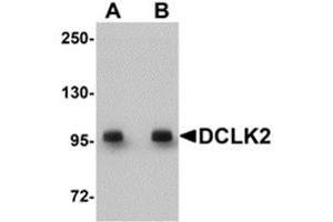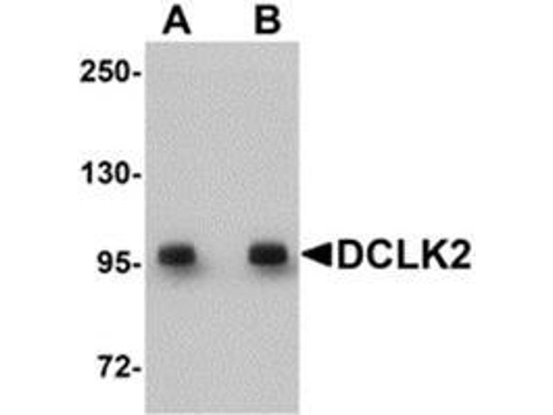 DCLK2 is one of three doublecortin-like kinases similar to the Ca2+/calmodulin-dependent protein kinase (CaMK) family. DCLK2 mRNA, like that of the homologous DCLK1 and DCLK3, is highly expressed in adult brain, but only DCLK1 and DCLK2 transcripts are present in human fetal brain and the developing mouse embryo, suggesting that DCLK1 and DCLK2 may play roles in cortical development. The DCLK proteins are homologous to Doublecortin (DCX), a protein that is mutated in X-linked human lissencephaly. In mouse models where the DCX gene has been disrupted, DCLK1 expression increases slightly and appears to compensate for the loss of DCX, as mice mutant for both DCX and DCLK1 show a severe phenotype including perinatal lethality, disorganized neocortical layering, and profound hippocampal cytoarchitectural disorganization. Unlike DCLK1, DCLK2 expression does not change in DCX-null mice.Synonyms: CLICK2, DCAMKL2, DCDC3B, DCK2, DCLK2, DKFZp761I032, Serine/threonine-protein kinase DCLK2