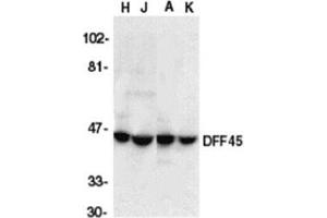 ELISA. Western Blot: DFF45 antibody can be used for detection of DFF45 and one of the cleavedfragments of DFF45 at 1/1000 to 1/2000 dilution. A 45 kDa band can be detected innon-apoptotic cells. Immunocytochemistry. Immunoprecipitation: DFF45 antibody can be used for detection of DFF45 and one of thecleaved fragments of DFF45 at 1/1000 to 1/2000 dilution. Other applications not tested. Optimal dilutions are dependent on conditions and should be determined by the user.