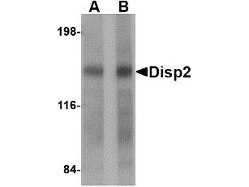 ELISA. Western Blot: Disp2 antibody can be used for the detection of Disp2 by Western blot at 1 -2 μg/mL. Other applications not tested. Optimal dilutions are dependent on conditions and should be determined by the user.