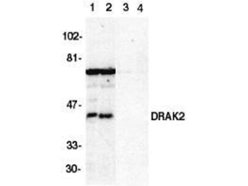 Apoptosis is mediated by death domain containing adapter molecules and a caspase family of proteases. Certain serine/threonine protein kinases, such as ASK-1 and RIP, are mediators of apoptosis. Two novel serine/threonine kinases that induce apoptosis were recently identified and designated DRAK1 and DRAK2 (for DAP kinase-related apoptosis-inducing protein kinases) (1). DRAKs contain an N-terminal kinase domain and a C-terminal regulation domain. Overexpression of DRAK2 induces apoptosis. DRAKs have high sequence homology to DAP and ZIP kinases, and they represent a novel family of serine/threonine kinases, which mediates apoptosis through their catalytic activities. DRAK2 is located in nucleus and the messenger RNA was ubiquitously expressed in human tissues (1).Synonyms: DAP kinase-related apoptosis-inducing protein kinase 2, Serine/threonine-protein kinase 17B