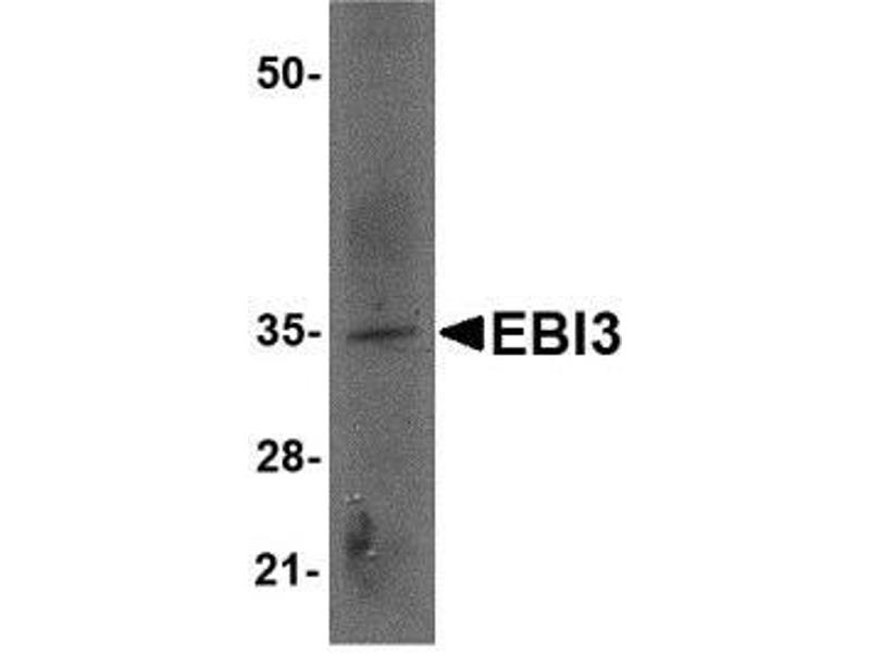 EBI3 is a subunit in two distinct heterodimeric cytokines: interleukin-27 (IL-27) and IL-35 (1-3). Like interleukin-23 (IL-23), IL-27 is a recently discovered member of the IL-6/IL-12 family of proinflammatory and immunoregulatory cytokines. It exists as a heterodimer composed of the p40-related protein EBI3 and an IL-12 p35-related protein termed p28. IL-27 is produced after activation by antigen-presenting cells and induces proliferation of naive but not memory CD4+ T-cells. It acts by binding to its receptor WSX-1 (also known as TCCR) and gp130 which results in the activation of a Jak/STAT signaling cascade, suggesting the IL-27 is involved in the regulation of immune processes. It has been suggested that IL-27 can also be used as a therapeutic agent against cancer as it can also induce tumor-specific anti-tumor activity mediated through CD8+ T-cells, IFN-g, and T-bet. IL-35 is composed of EBI3 and the p35 subunit of IL-12 and has been reported to have therapeutic effects against collagen-induced arthritis by expanding the population of regulatory T cells and suppressing Th17 cells. At least two isoform of EBI3 are known to exist.Synonyms: EBV-induced gene 3 protein, Epstein-Barr virus-induced gene 3 protein, IL-27 subunit beta, IL-27B, Interleukin-27 subunit beta