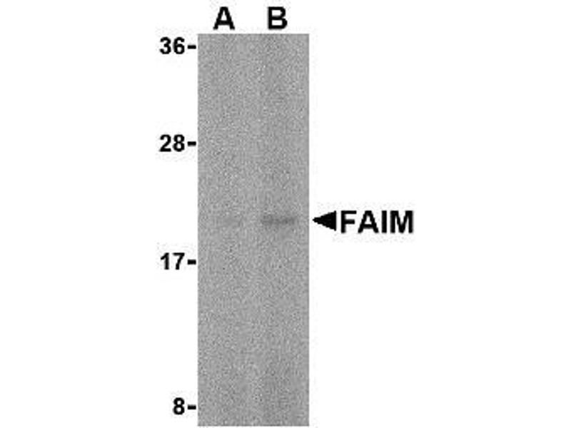 - The susceptibility of primary splenic B cells to Fas-mediated apoptosis is regulated in a receptor-specific fashion. Terminal effectors of B cell Fas-resistance include the known anti-apoptotic proteins Bcl-xL, FLIP, and a recently identified protein termed FAIM. This molecule is broadly expressed in various tissues and exists in at least three isoforms. It is thought that resistance to Fas killing via increased expression of FAIM protects foreign antigen-specific B cells during interactions with FasL-bearing T cells whereas autoreactive B cells are deleted via Fas-dependent cytotoxicity. More recent results have indicated that FAIM interacts with both Trk and p75 neurotrophin receptor and may play a role in promoting neurite outgrowth in different neuronal systems by a mechanism involving the activation of NF-kappaB and the Ras-ERK pathway.Synonyms: FAIM-1, FAIM1, Fas Apoptotic Inhibitory Molecule 1