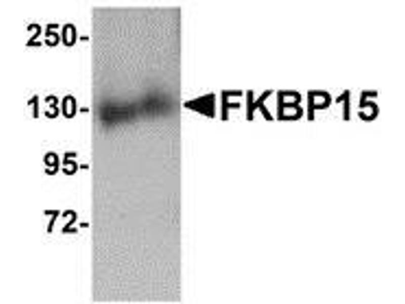 FKBP15, also known as FKBP133, is a member of the FK506-binding protein family, a group of proteins initially identified as immunophilins, targets for the immunosupressant drugs FK506 and Rapamycin. FKBP15 is expressed in the developing nervous system and contains a domain similar to Wiskott-Aldrich syndrome protein homology region 1 (WH1) in addition to the FK506-binding protein motif. FKBP15 is distributed along the axonal shafts and partially co-localizes with F-actin in the growth cones of dorsal root ganglion neurons, overexpression of FKBP15 resulted in the number of filopodia in transfected neurons, suggesting that FKBP15 modulates growth cone behavior. FKBP15 has also been shown to associate with both microtubules and the actin filament systems and disruption of its expression by RNAi resulted in delayed transport of early endosomes in HeLa cells indicating that FKBP15 is also involved in the transport of early endosomes. At least three isoforms of FKBP15 are known to exist.Synonyms: 133 kDa FK506-binding protein, FK506-binding protein 15, FKBP133, KIAA0674, WAFL, WASP and FKBP-like