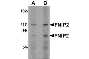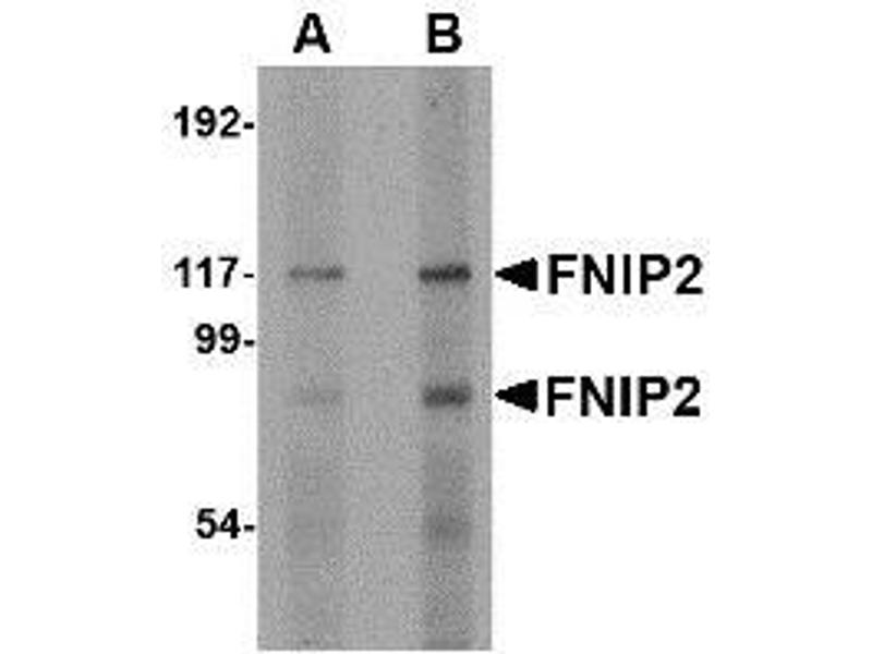 FNIP2 is the second protein found to interact with folliculin, the product of the Birt-Hogg-Dube (BHD) gene. Folliculin is thought to act as a tumor suppressor as mutations or loss of heterozygosity in this gene are associated with BHD syndrome-related renal tumors. Folliculin and FNIP1, a protein that shares 49 % identity to FNIP2, bind to AMPK, an important energy sensor in cells that negatively regulates the mammalian target of rapamycin (mTOR), a protein that is thought to be the master switch for cell growth and proliferation. FNIP1 and FNIP2 are able to form homo- and heteromeric multimers, suggesting these proteins may have a functional relationship. Multiple isoforms of FNIP2 are known to exist. This antibody is predicted to not cross-react with FNIP1.Synonyms: FNIP1-like protein, FNIPL, Folliculin-interacting protein 2, KIAA1450, MAPO1, O6-methylguanine-induced apoptosis 1 protein