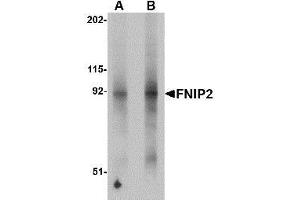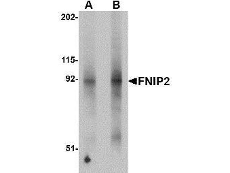 FNIP2 is the second protein found to interact with folliculin, the product of the Birt-Hogg-Dube (BHD) gene. Folliculin is thought to act as a tumor suppressor as mutations or loss of heterozygosity in this gene are associated with BHD syndrome-related renal tumors. Folliculin and FNIP1, a protein that shares 49 % identity to FNIP2, bind to AMPK, an important energy sensor in cells that negatively regulates the mammalian target of rapamycin (mTOR), a protein that is thought to be the master switch for cell growth and proliferation. FNIP1 and FNIP2 are able to form homo- and heteromeric multimers, suggesting these proteins may have a functional relationship. Multiple isoforms of FNIP2 are known to exist. This antibody is predicted to not cross-react with FNIP1.Synonyms: FNIP1-like protein, FNIPL, Folliculin-interacting protein 2, KIAA1450, MAPO1, O6-methylguanine-induced apoptosis 1 protein