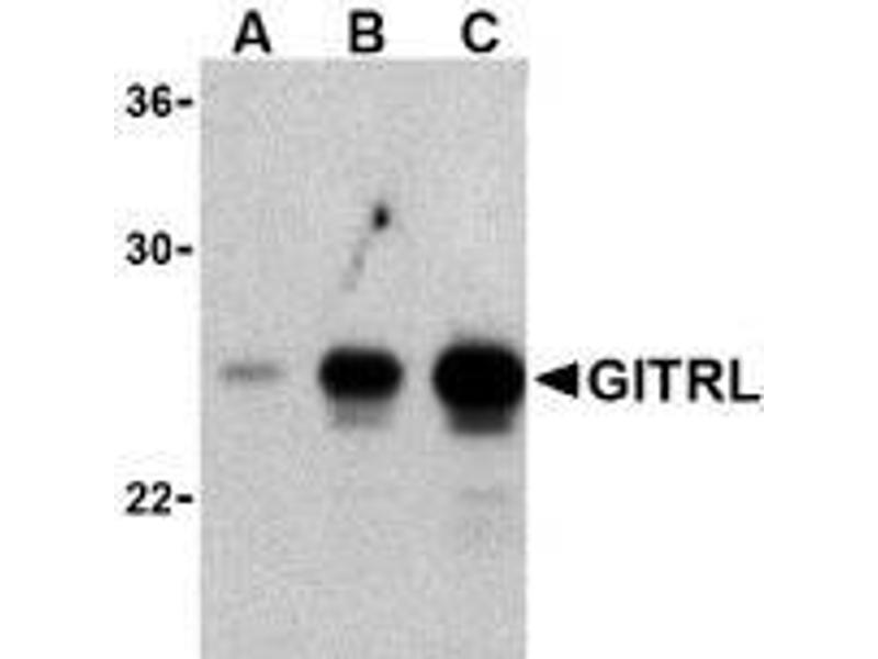 The tumor necrosis factor (TNF) and TNF receptor (TNFR) gene superfamilies regulate numerous biological functions including cell proliferation, differentiation, and survival through regulating the activation of the transcription factor NF-kappaB and various mitogen-activated protein kinases (reviewed in 1). The glucocorticoid-induced tumor necrosis factor receptor (GITR) is an emerging member of this family that is expressed on CD4+ CD25+ regulatory T cells and appears to have crucial immune regulation functions (2,3). Its ligand GITRL is expressed in endothelial and antigen-presenting cells (4) and can activate NF-kappaB, induce both pro- and anti-apoptotic effects, inhibit the suppressive activity of regulatory T cells, and co-stimulate responder T cells through GITR (5). Dominant negative forms of NIK and TRAF2 expressed in transfected 293 cells substantially inhibited NF-kappaB activation, suggesting that the GITRL-GITR pathway involves both NIK and TRAF2 (4).Synonyms: AITRL, Activation-inducible TNF-related ligand, GITRL, Glucocorticoid-induced TNF-related ligand, TL6, Tumor necrosis factor ligand superfamily member 18, hGITRL