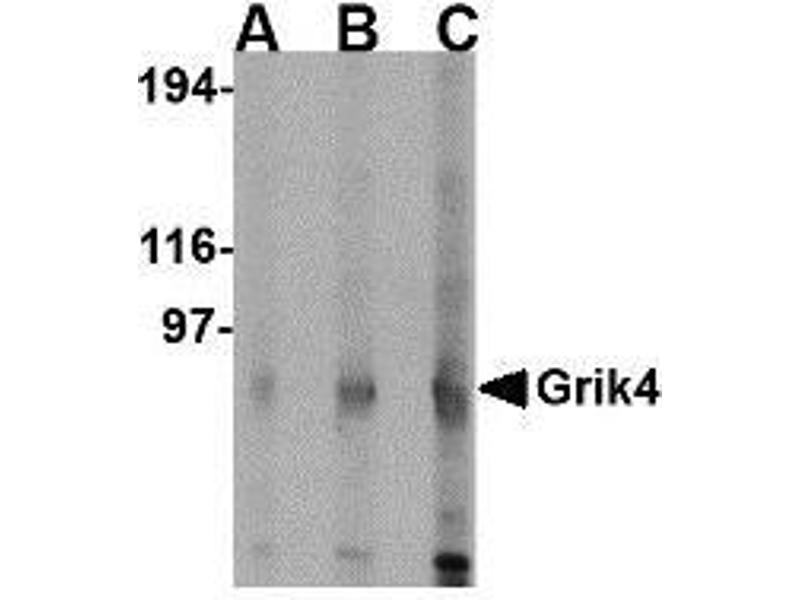 Grik4 codes for the KA1 subunit of kainate-type ionotropic glutamate receptors which are critical regulators of network activity that act by modifying neuronal excitability, directly and indirectly, through GABAergic interneurons. Five subunits can assemble to form kainate receptors (KARs): GluR5 (coded by Grik1), GluR6 (coded by Grik2), and GluR7 (coded by Grik3) are the low-affinity subunits, and KA1 and KA2 are the high-affinity subunits. In the adult brain, KARs are located pre- and postsynaptically on pyramidal cells and on interneurons. Kainate receptors on GABA-containing interneurons enhance GABA release and thereby downregulate glutamatergic signaling. KARs have been implicated in numerous psychiatric disorders. Case control studies show significant association of Grik4 with both schizophrenia and bipolar disorder. Despite its predicted molecular weight, Grik4 often migrates at a lower molecular weight in SDS-PAGE.Synonyms: EAA1, Excitatory amino acid receptor 1, Glutamate receptor ionotropic kainate 4