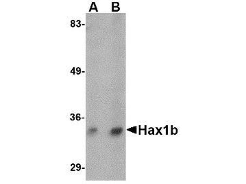 The HS-1 associated protein X-1 (Hax1) was initially identified in a yeast two-hybrid assay on the basis of its ability to bind to the hemapoietic cell-specific protein 1 (HS-1). Hax1 possesses anti-apoptotic activity and is structurally related to Bcl-2 family members, including the presence of BH1- and BH2-like domains. It has recently been shown to interact with HIV viral protein R (Vpr), a protein required for viral pathogenesis of HIV and linked to T-cell apoptosis through activation of caspases 3 and 9. Other studies indicate that Hax1-mediated processing of HtrA2 (also known as Omi) by the mitochondrial protease PARL allows survival of lymphocytes and neurons when cytokines are limiting. At least four isoforms of Hax1 are known to exist. This antibody is predicted to recognize Hax1b.Synonyms: HAX-1, HCLS1-associated protein X-1, HS1-associating protein X-1, HS1-binding protein 1, HS1BP1