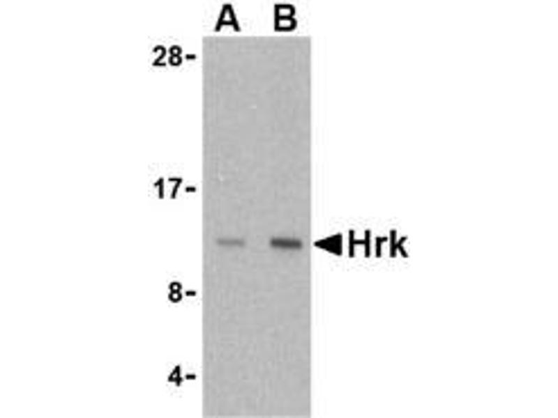 Apoptosis plays a major role in normal organism development, tissue homeostasis, and removal of damaged cells. Hrk, a pro-apoptotic member of the Bcl-2 homology domain-3 (BH3)-only group of the Bcl-2 family of proteins, was also identified as novel protein induced during programmed neuronal death. It lacks significant homology to other Bcl-2 family members except for an 8-amino acid region that is similar to the BH3 motif of Bik. Hrk regulates apoptosis through interaction with the anti-apoptotic proteins Bcl-2 and Bcl-XL via this domain. It does not interact with the pro-apoptotic proteins Bax, Bak, or Bcl-XS. Hrk localizes to mitochondrial membranes in a pattern similar to that previously reported for Bcl-2 and Bcl-XL. Despite its predicted molecular weight, Hrk often migrates at 12-15 kDa.Synonyms: Activator of apoptosis harakiri, BH3-interacting domain-containing protein 3, BID3, Neuronal death protein DP5