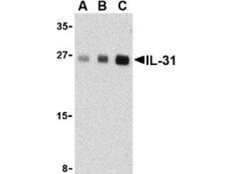 ELISA. Western Blot: 2.5 - 5 μg/mL. Despite its predicted size, IL-31 runs at approximately 27 - 30 kDa in SDS-PAGE. Other applications not tested. Optimal dilutions are dependent on conditions and should be determined by the user.