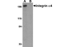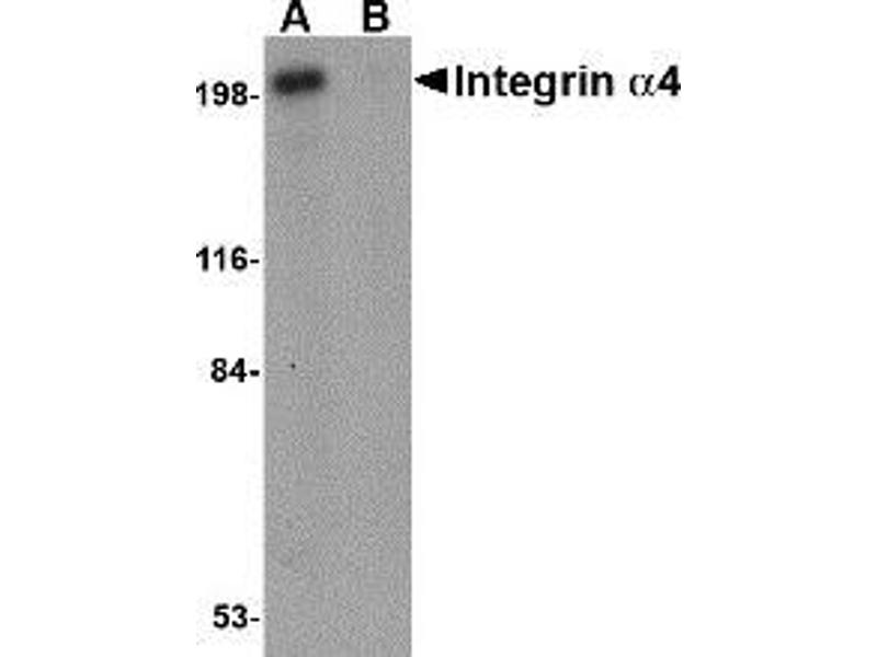 The integrin alpha 4 (also known as CD49d and ITGA4) belongs to the integrin alpha chain family of proteins. Integrins are heterodimeric integral membrane proteins composed of an alpha and beta chains. Alpha 4 chain associates with either beta 1 or beta 7 chain. It has been demonstrated that the putative ligand-binding sites of both integrin alpha 4 beta 1 and alpha 4 beta 7 is located on the alpha 4 chain. These ligands included Madcam, VCAM, and fibronectin. Madcam is known as the principal ligand for integrin alpha 4 beta 7. Recently it was also demonstrated that HIV-1 envelope can mimic Madcam by binding to and signaling though integrin alpha 4 beta 7, the gut mucosal homing receptor for peripheral T cells. Despite its predicted molecular weight, Integrin alpha 4 will often run at higher molecular weight in SDS-PAGE. At least two isoforms are known to exist. The immunogen to this antibody is outside of the Integrin alpha 4 recombinant protein fragment and thus will not recognize it.Synonyms: CD49 antigen-like family member D, Integrin alpha-4, Integrin alpha-IV, VLA-4, VLA4