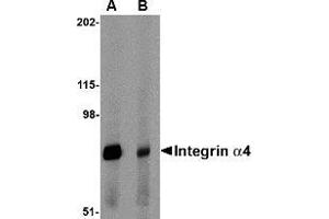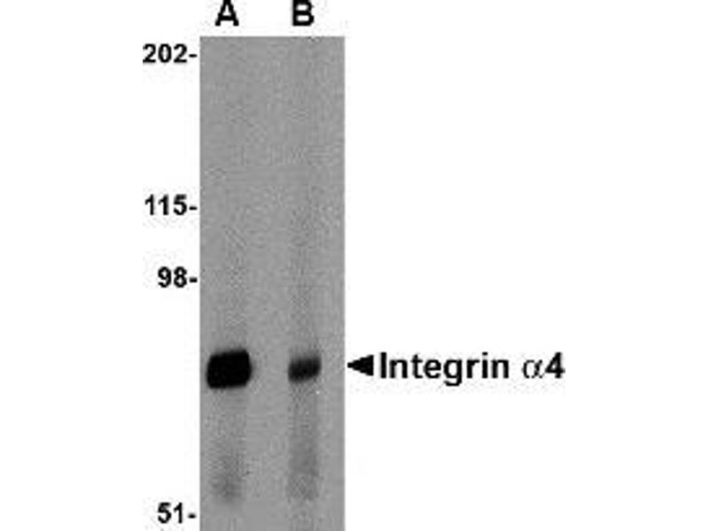 The integrin alpha 4 (also known as CD49d and ITGA4) belongs to the integrin alpha chain family of proteins. Integrins are heterodimeric integral membrane proteins composed of an alpha and beta chains. Alpha 4 chain associates with either beta 1 or beta 7 chain. It has been demonstrated that the putative ligand-binding sites of both integrin alpha 4 beta 1 and alpha 4 beta 7 is located on the alpha 4 chain. These ligands included Madcam, VCAM, and fibronectin. Madcam is known as the principal ligand for integrin alpha 4 beta 7. Recently it was also demonstrated that HIV-1 envelope can mimic Madcam by binding to and signaling though integrin alpha 4 beta 7, the gut mucosal homing receptor for peripheral T cells. Despite its predicted molecular weight, Integrin alpha 4 will often run at higher molecular weight in SDS-PAGE. At least two isoforms are known to exist. The immunogen to this antibody is within the Integrin alpha 4 recombinant protein fragment and thus will recognize it.Synonyms: CD49 antigen-like family member D, Integrin alpha-4, Integrin alpha-IV, VLA-4, VLA4
