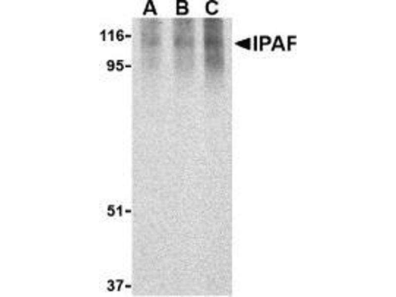 Apoptosis is related to many diseases and induced by a family of cell death receptors and their ligands. Cell death signals are transduced by death domain containing adaptor molecules and proteases including several members of the caspase family. Another family of proteins that functions as a critical regulator of apoptosis and NF-kappaB signaling pathways is the CED-4/Apaf-1 (apoptosis protein activating factor-1) protein family (1). Ipaf (ICE protease activating factor) is a CED-4/Apaf-1 family member that activates caspase-1/ICE and can induce apoptosis in human cells in a caspase-1 dependent manner (2,3). Ipaf and caspase-1 are thought to interact with each other through the association of the Ipaf amino-terminal CARD (caspase recruitment domain) and amino-terminal CARD of caspase-1.Synonyms: CARD12, CLAN, CLAN1, IPAF, NLR family CARD domain-containing protein 4