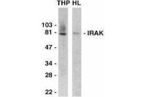 ELISA. Western Blot: 1/1000. Immunocytochemistry. Immunoprecipitation: 2 to 4 μg per sample. An 80 kDa band should be detected in the lysate from non-activated cells. It has no crossresponse to IRAK2. Other applications not tested. Optimal dilutions are dependent on conditions and should be determined by the user.