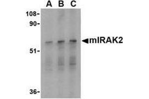 IRAK2 antibody was raised against a peptide corresponding to 17 amino acids near the carboxy-terminus of mouse IRAK2a which is common to all four isoforms. mIRAK2 antibody will also recognize human IRAK2. Anti-IRAK2 has no cross response to IRAK. Anti-IRAK2 will also recognize human IRAK2.