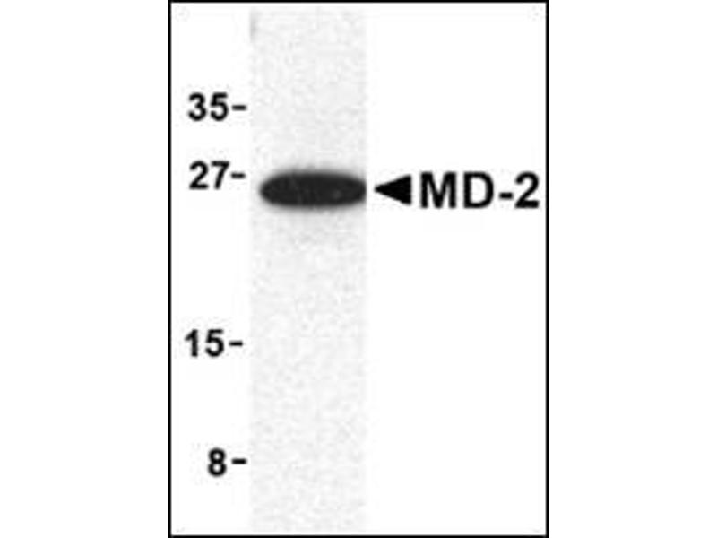 MD-2 is a member of the Toll/interleukin-1 receptor (TIR) family, a group of proteins that include the Toll-like receptors (TLRs) (1-3). TLRs are signaling molecules that recognize different pathogen-associated molecular patterns (PAMPs) and serve as an important link between the innate and adaptive immune responses (4). TLR4, the major signaling receptor for lipopolysaccharide (LPS), requires the binding of MD-2 to its extracellular region for maximal response to LPS (5,6). The specificity of this response is determined by the species of MD-2, e.g., human MD-2 can cause mouse TLR4 to react to LPS analogs that are normally antagonistic to human but not mouse TLR4 (7).Synonyms: ESOP-1, ESOP1, LY96, Lymphocyte antigen 96, MD2