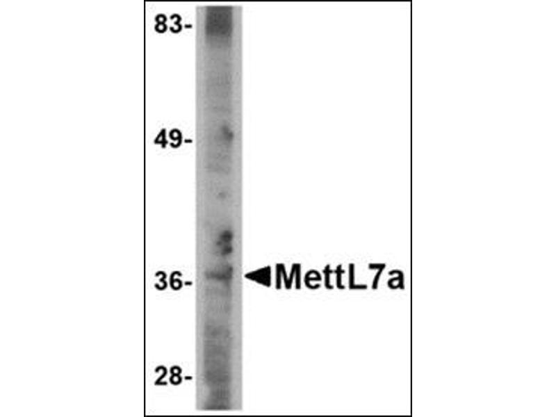 MettL7A belongs to the methyltransferase superfamily. It is a probable methyltransferase. Methyltransferase is a type of transferase enzyme which transfers a methyl group from a donor to an acceptor. Often methylation occurs on nucleic bases in DNA or amino acids in protein structures. DNA methylation is often utilized to silence and regulate genes without changing the original DNA sequence. DNA methylation may be necessary for normal growth from embryonic stages in mammals. When mutant embryonic stem cells lacking the murine DNA methyltransferase gene were introduced to a germline of mice they caused a recessive lethal phenotype. Methylation may also be linked to cancer development as methylation of tumor suppressor genes promotes tumorgenesis and metastasis. At least two isoforms of MettL7A are known to exist.Synonyms: Methyltransferase-like protein 7A, PRO0066, UNQ1902/PRO4348
