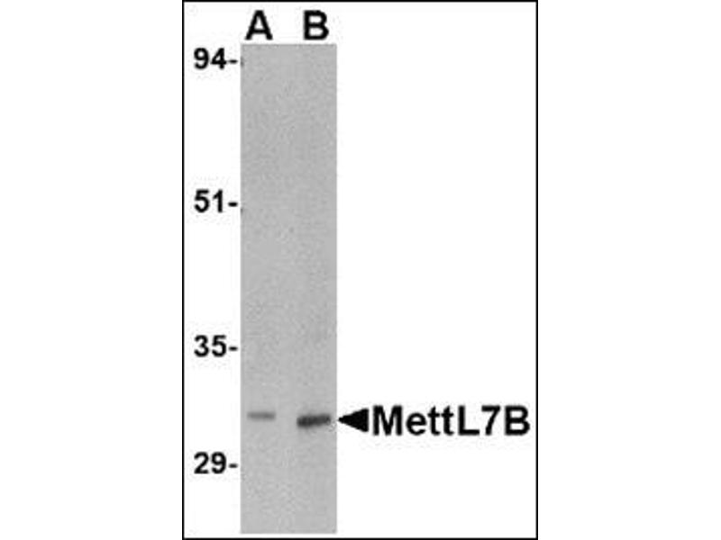MettL7B belongs to the methyltransferase superfamily. It is a probable methyltransferase. Methyltransferase is a type of transferase enzyme which transfers a methyl group from a donor to an acceptor. Often methylation occurs on nucleic bases in DNA or amino acids in protein structures. DNA methylation is often utilized to silence and regulate genes without changing the original DNA sequence. DNA methylation may be necessary for normal growth from embryonic stages in mammals. When mutant embryonic stem cells lacking the murine DNA methyltransferase gene were introduced to a germline of mice they caused a recessive lethal phenotype. Methylation may also be linked to cancer development as methylation of tumor suppressor genes promotes tumorgenesis and metastasis. This MettL7B antibody is predicted to not cross-react with MettL7A.Synonyms: Methyltransferase-like protein 7B, UNQ594/PRO1180