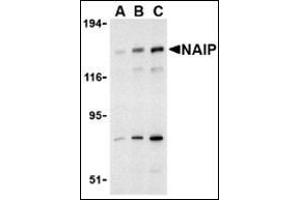 Neuronal apoptosis inhibitor protein (NAIP) was the first human inhibitor of apoptosis protein (IAP) identified and was discovered by its association with the neurodegenerative disorder spinal muscular atrophy (1,2). Members of the IAP family contain one to three copies of an approximately 70 amino acid motif termed baculovirus IAP repeat (BIR), these BIRs promote protein-protein interactions with various caspases such as caspase-3, -7, and -9 as well as members of the TRAF family of signal molecules (reviewed in 3). Unlike other IAPs however, NAIP requires ATP to bind caspase-9 and is not inhibited by the IAP-inhibiting molecule Smac/DIABLO (4), suggesting that NAIP is unique among the IAPs in its regulation of its activity. Finally, although only one human NAIP protein has been identified, other shorter NAIP mRNA transcripts have been reported (5).Synonyms: BIRC1, Baculoviral IAP repeat-containing protein 1