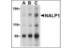 NALP1 belongs to a family of cytoplasmic proteins that have been implicated in cell responses to apoptotic and inflammatory stimuli (1). It contains a caspase recruitment domain (CARD) in addition to a NACHT domain and leucine rich repeat (LRR). This protein interacts strongly with caspase 2 and weakly with caspase 9, as well as with Apaf-1 (2). Transient overexpression of this gene in cultured cells was sufficient to induce apoptosis (3). NALP1 mRNA and protein expression levels in myeloid leukemia cells are increased following CREB (cAMP-response element binding protein) activation, suggesting that NALP1 may contribute to modulate the response of these cells to pro-inflammatory stimuli (4). Multiple alternatively spliced transcript variants encoding distinct isoforms have been found for NALP1 (3).Synonyms: Caspase recruitment domain-containing protein 7, DEFCAP, Death effector filament-forming ced-4-like apoptosis protein, KIAA0926, LRR and PYD domains-containing protein 1, NAC, NACHT, NALP1, Nucleotide-binding domain and caspase recruitment domain