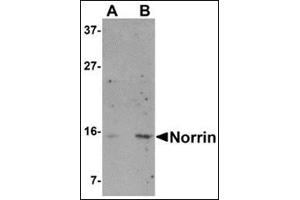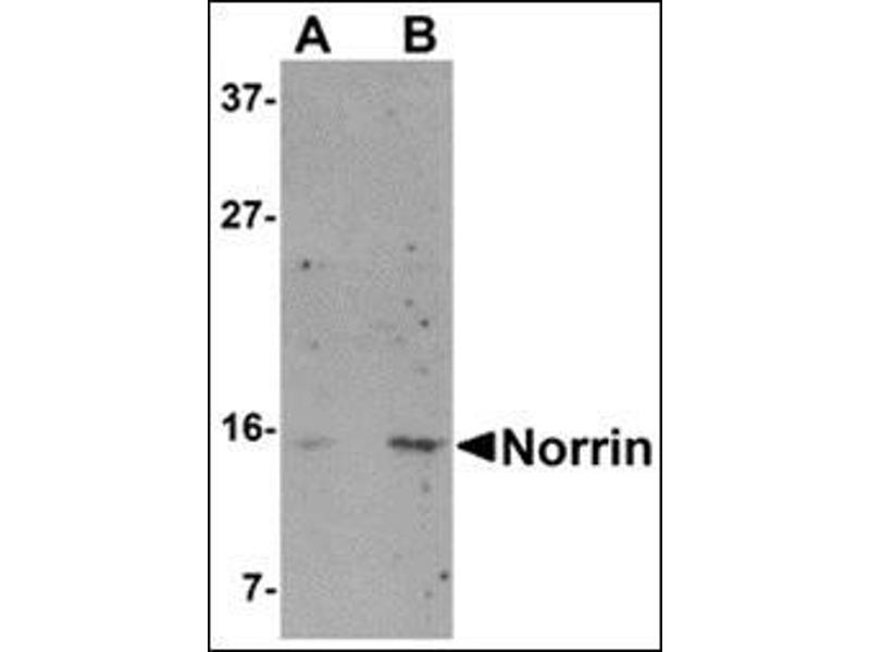 Norrie disease is an X-linked genetic disorder characterized by progressive atrophy of the eyes, mental disturbances and deafness. The gene responsible for this disease was initially identified through positional cloning. Norrin, the gene product, encodes a small secreted, cysteine-rich protein that is thought to act as a ligand for the Wnt-receptor/b-catenin signal pathway despite having sequence homology with the Wnt family of proteins. Mice lacking this gene have abnormal blood vessel growth in the vitreous and a disorganized retina, transgenic ectopic expression of Norrin restores normal retinal vasculature. Recent evidence shows that Norrin can attenuate tPA and uPA-mediated death of transformed rat retinal ganglion cells (RGC-5) by activating the Wnt/b-catenin pathway and regulating the phosphorylation of LRP-1, a cell surface receptor for tPA and uPA, suggesting the Norrin may function in vivo by regulating kinases which may alter the phosphorylation of LRP-1.Synonyms: EVR2, Norrie disease protein, Norrin