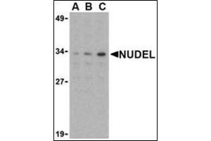 Nudel was initially discovered as a protein homologous to Aspergillus NUDE and that associated with Lis1 and polyprotein complex cytoplasmic dynein, both of which have been linked to neuronal development and migration (1,2). It was later shown to be a substrate of cdk5, a kinase known to be critical during neuronal migration, phosphorylation of Nudel by cdk5 affects its localization in neurons and affects neuritic morphology (1,3). It is thought that together with Lis1, Nudel regulates cytoplasmic dynein, a large polyprotein complex, in neuronal migration and mitosis through direct interactions (4). Similar interactions are thought to also play a role in membrane traffic in other cells as disruption of Nudel expression through RNA interference perturbed normal endomembrane flux and resulted in the fragmentation of the Golgi apparatus (3).Synonyms: EOPA, MITAP1, NUDEL, Nuclear distribution protein nudE-like 1