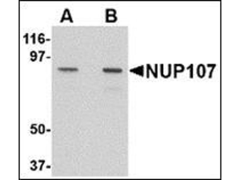 The nuclear pore complex (NPC) is a protein assembly localized at the nuclear rim and mediates macromolecular transport between the nucleus and the cytoplasm. The mammalian nucleoporin (NUP)-107 is part of the hetero-oligomeric complex that also contains NUP160, NUP133, NUP96, and mammalian homolog of yeast sec13p. While the majority of the NUP107-160 nuclear pore sub-complex localizes to the nuclear pore, a small fraction is observed at kinetochores and pro-metaphase spindle poles in mitotic cells in association with proteins such as Mad1, Mad2, Bub3 and Cdc20. Immunodepletion of the NUP107-160 complex resulted in defective spindle assembly indicating that it has multiple functions. NUP107 has recently been identified as an HIV dependency factor (HDF), suggesting that NUP107 may be an important drug target in HIV treatment. Multiple isoforms of NUP107 are known to exist.Synonyms: NUP84, Nuclear pore complex protein Nup107, Nucleoporin Nup107