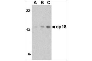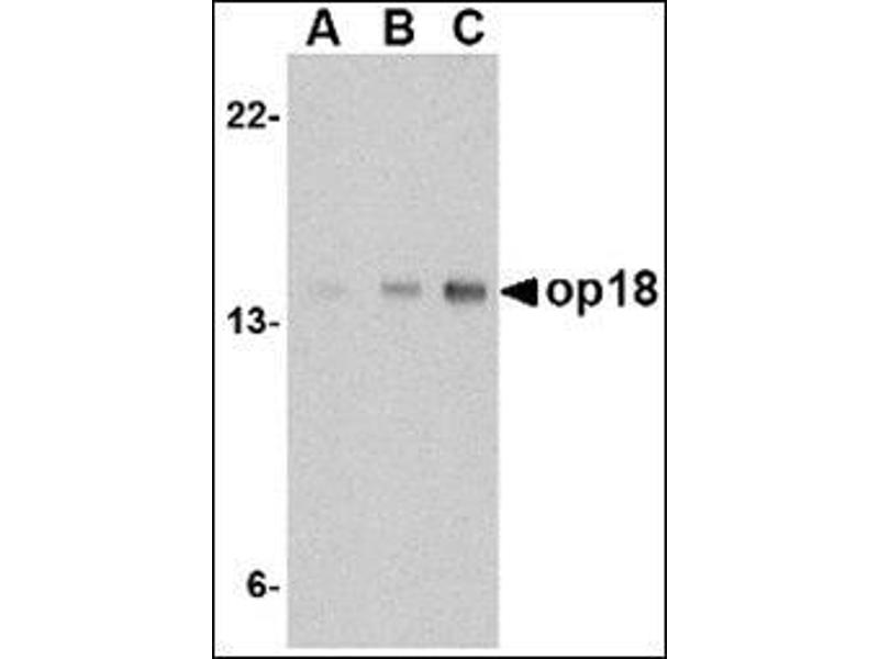 Op18 belongs to the stathmin family of genes and encodes a ubiquitous cytosolic phosphoprotein that may function as an intracellular relay integrating several signaling pathways such as those involved in cell proliferation and differentiation. Op18 has also been shown to be involved in the regulation of the microtubule filament system by destabilizing microtubules, thereby preventing assembly and promoting the disassembly of microtubules. More recently, op18 has been implicated as a potential target of the ASK1-p38 MAP kinase cascade, suggesting that the ASK1-p38 cascade may regulate microtubule dynamics through op18. Op18 is highly expressed in a wide variety of human malignancies, including leukemia, prostate cancer, ovarian carcinoma, and breast carcinoma, suggesting that op18 may be an ideal target for anti-cancer therapeutics.Synonyms: LAP18, Leukemia-associated phosphoprotein p18, Metablastin, OP18, Oncoprotein 18, Op18, Phosphoprotein p19, Prosolin, Protein Pr22, pp17, pp19